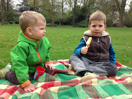 Nach dem Kaffeetrinken sind wir in den Luisenpark. Mattes wollte Picknick machen. Also haben wir nach einem Abstecher im Tropenhaus ein Picknick gemacht. Mit Eis. Und anschließend gab es noch Kekse. (Hoffentlich erfährt es Mama nicht!)