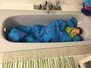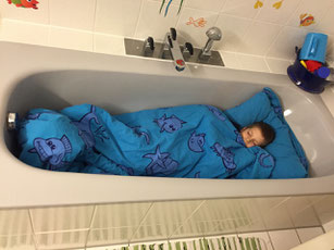 Nachdem Papa erzählt hatte, wie er als kleiner Junge eine Nacht in der Badewanne schlafen wollte, waren Mattes und Lasse hellauf begeistert und wollen nun auch mal in der Badewanne übernachten. Das Testliegen fand schon statt. (Sie wissen auch, dass Papa damals nachts von Omi & Opa Martin zurück ins Bett getragen wurde und finden das genauso wie Papa damals doof.)