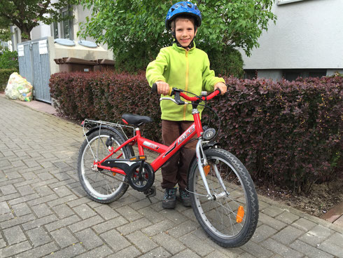 Die Mama vom kleinen Yannick hat uns einen Privatverkäufer vermittelt, der ein gebrauchtes Fahrrad abzugeben hatte. Heute haben wir es abgeholt. Hier siehst du Mattes auf seinen ersten 20 Metern